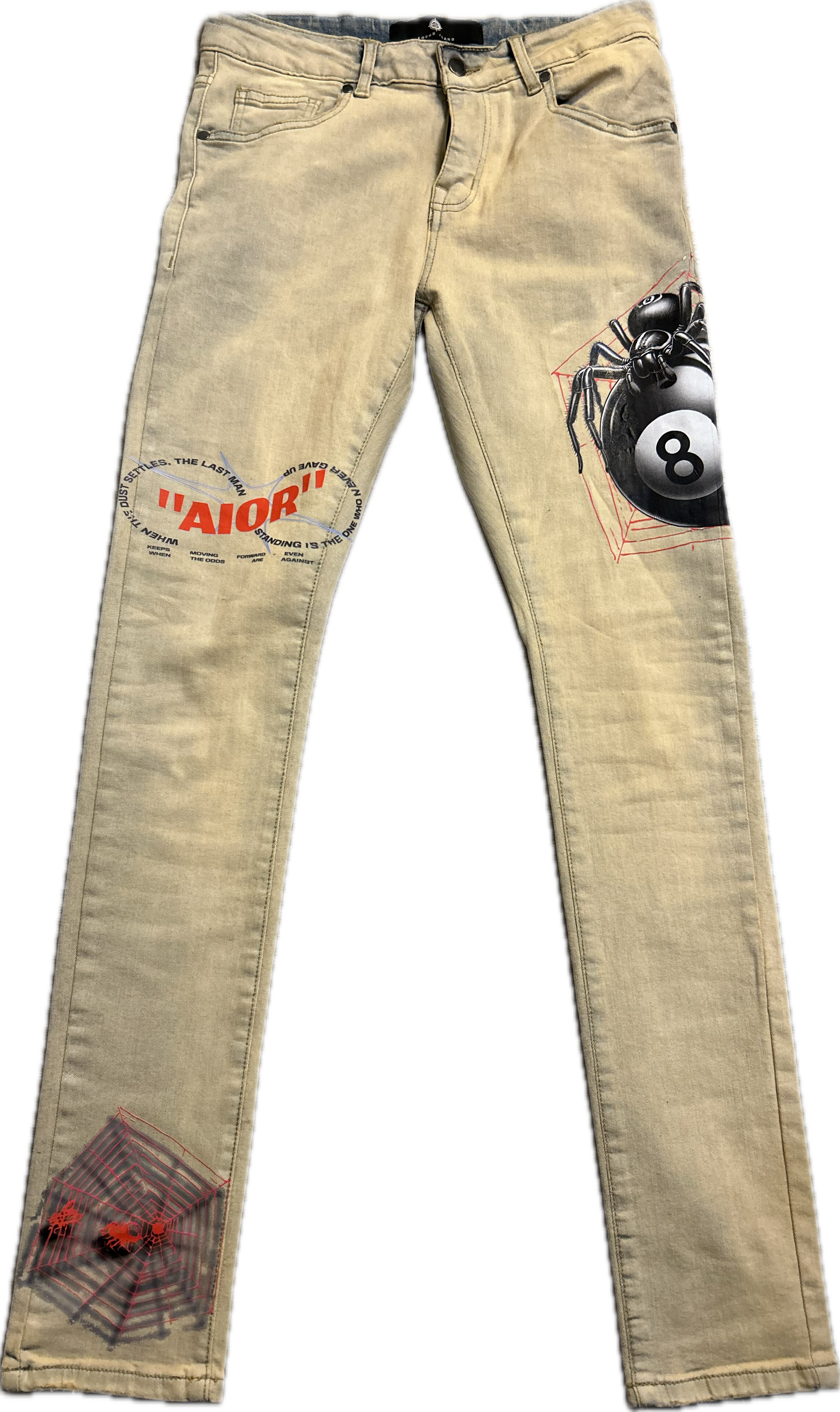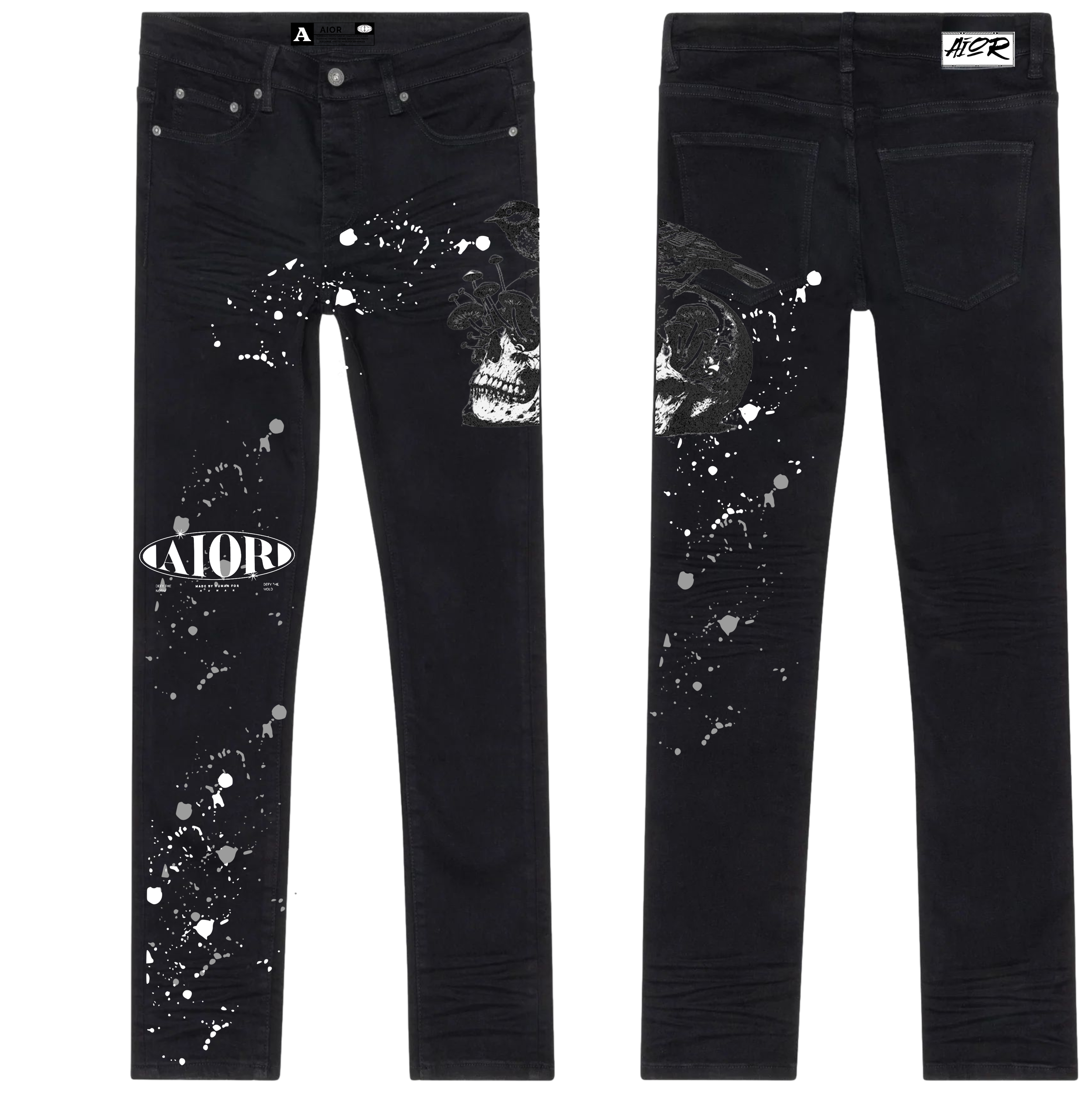The AIOR “High Stakes” Jeans bring bold energy to the table. Built on a sleek black denim base, these jeans are detailed with scattered multi-color dice graphics—green, teal, purple, and red—representing chance, risk, and reward. The red AIOR dice logo stamped on the thigh makes the fit undeniable.