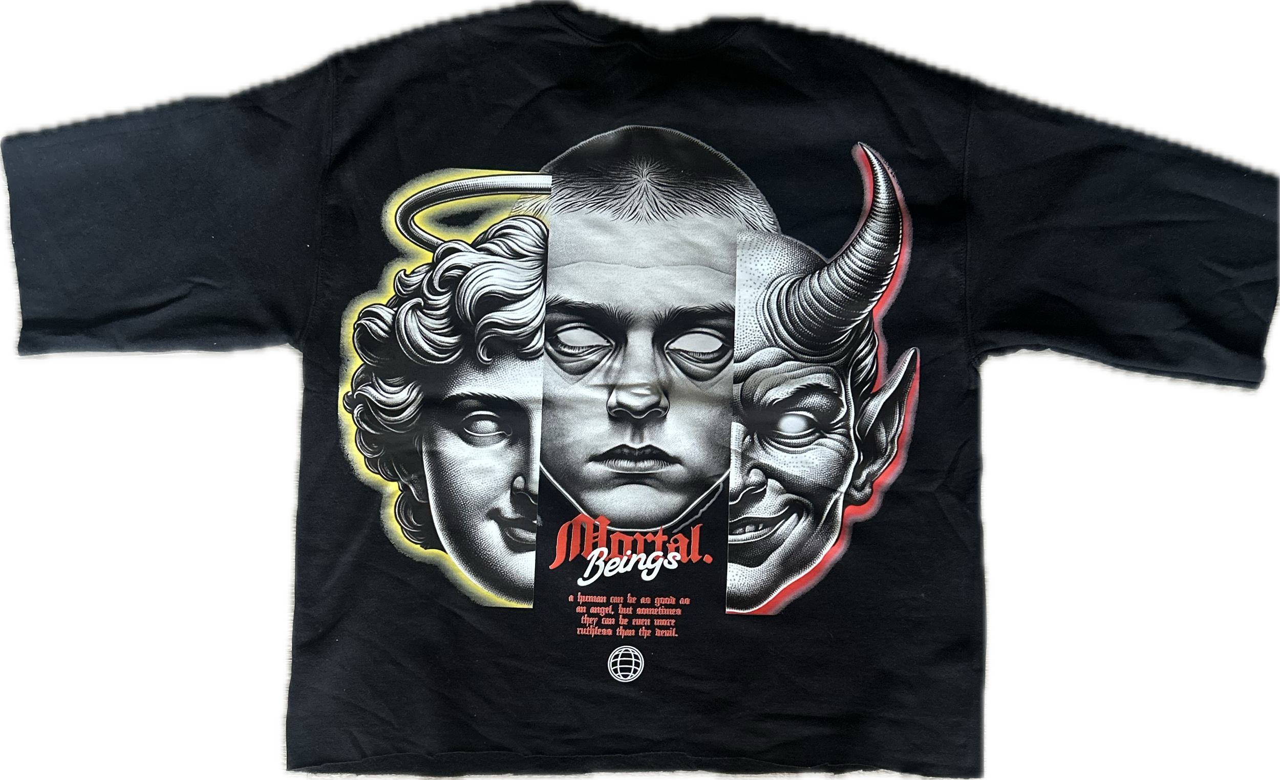 Oversized back print: “Gamblers Luck” with rolling dice, a pocket watch, and a story about fate & opportunity